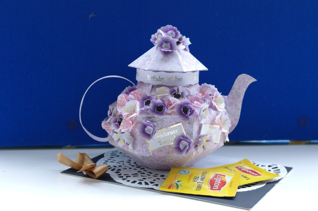 Our craft classes range from making 3D cards, such as the teapot sample shown in the photograph. We can create personalised projects such as journaling and memory books.